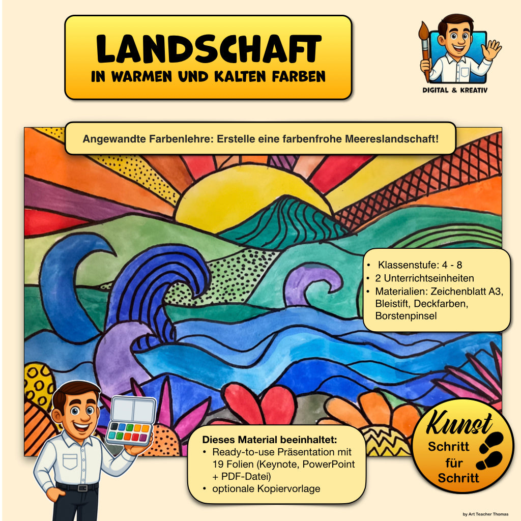 Mit diesem kreativen Kunstprojekt gestalten Schüler*innen eine farbenfrohe Meereslandschaft mit Deckfarben – und lernen dabei ganz praktisch, wie warme und kalte Farben wirken und wie man einen Bildaufbau sinnvoll plant.