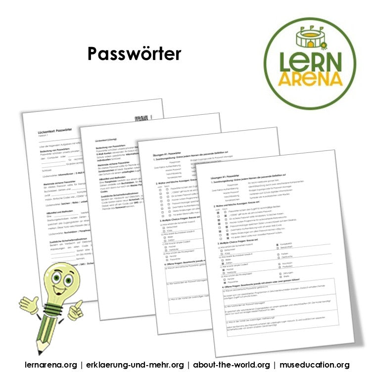 Das Material umfasst ein 10-seitiges Arbeitsheft mit mehreren abwechslungsreichen Aufgabenformaten. Enthalten sind drei Versionen eines Lückentexts zum Thema Passwörter, eine Lösungsseite zum Lückentext sowie drei Übungsblätter mit Lösungen. Die Aufgaben greifen zentrale Inhalte wie sichere Passwörter, Sonderzeichen, Passwort-Manager, Passphrasen, Verschlüsselung und zweistufige Verifizierung auf. Zusätzlich ist auf den Arbeitsblättern ein QR-Code zu einem Erklärvideo enthalten.